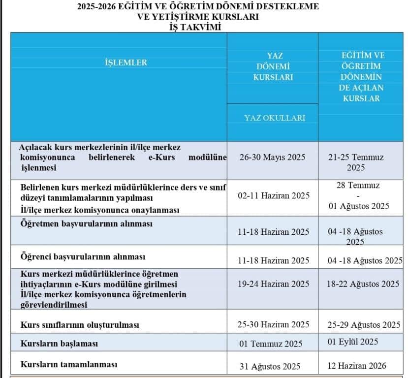 Buna göre Öğretmen ve öğrenciler 04-18 Ağustos 2025 tarihleri arasında Kurs merkezlerine başvuruda bulunacak olup DYK kursları 01 Eylül 2025'te başlayacak 12 Haziran 2026'da son bulacak.